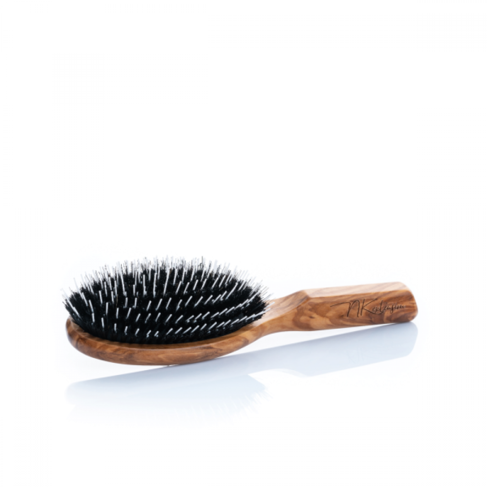 Edle Haarverlängerungsbürste aus Olivenholz mit Naturborsten und Nylon-Frisierpins. Das Haar erhält einen natürlichen Glanz bei optimaler Schonung der Verbindungsstellen. Die Bürste gleitet mühelos durch das Haar und entwirrt schonend. Olivenholz ist etwas ganz Besonderes. Es zählt zu den härtesten Hölzern der Welt. Durch den weichen honig-gelben Holzton entstehen unverwechselbare Unikate.