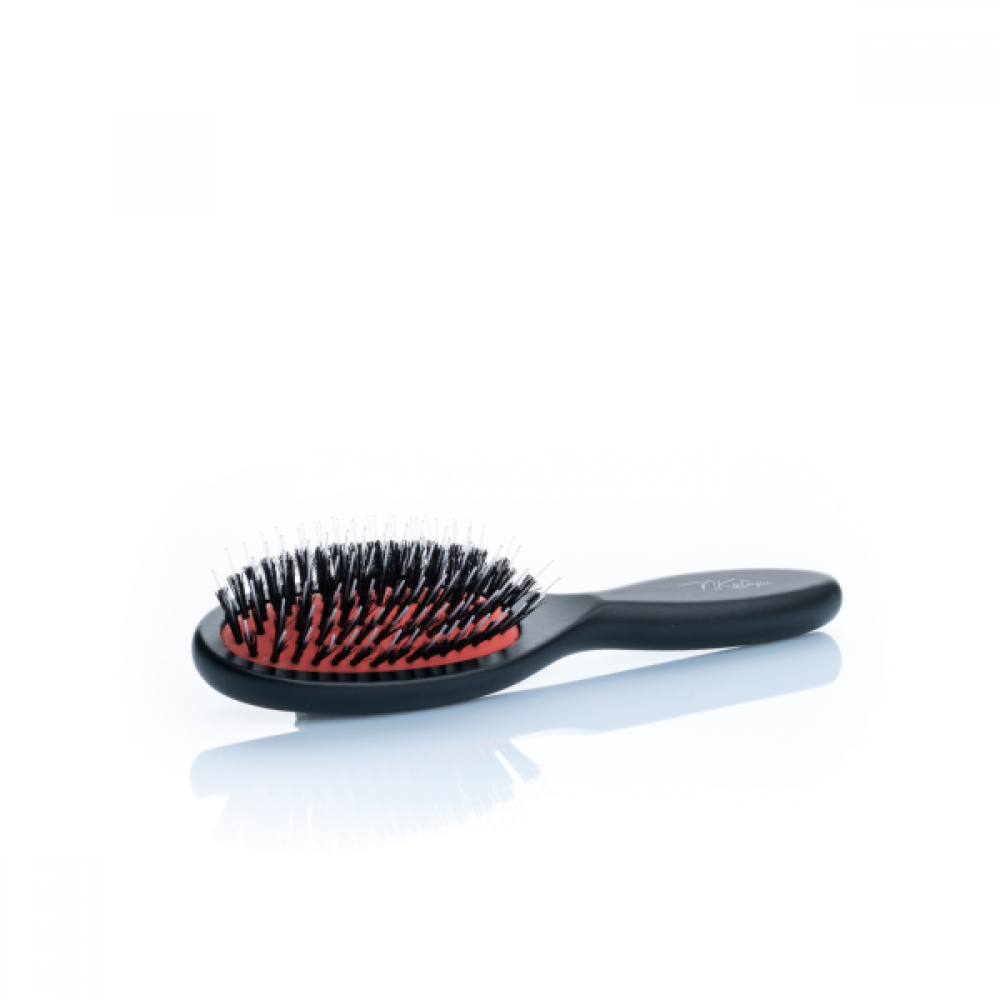 Kleine und handliche Haarverlängerungsbürste - perfekt für unterwegs! Schwarz matt lackiert mit rotem Kissen ist unsere neue Black Brush small der ideale Begleiter in jeder Handtasche.