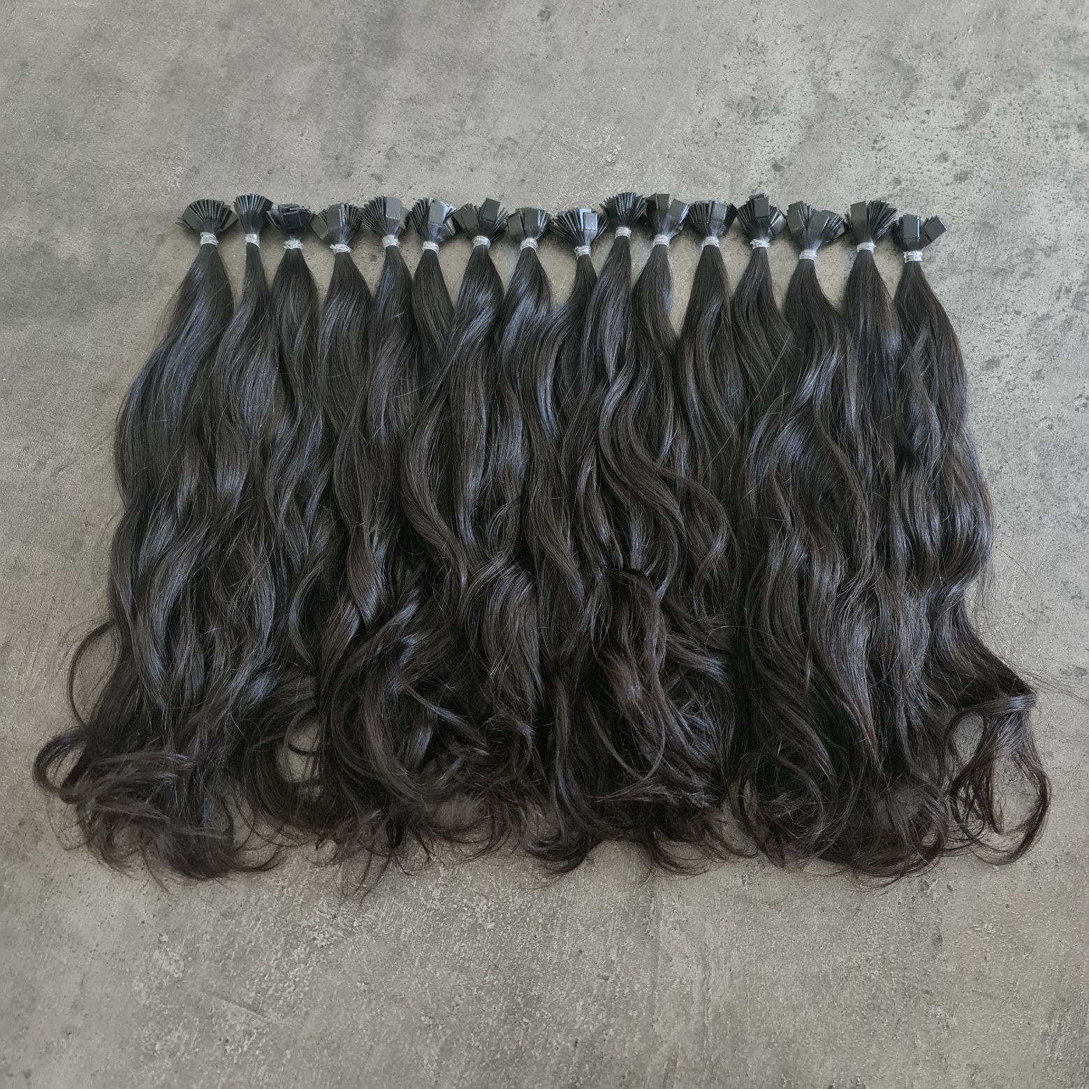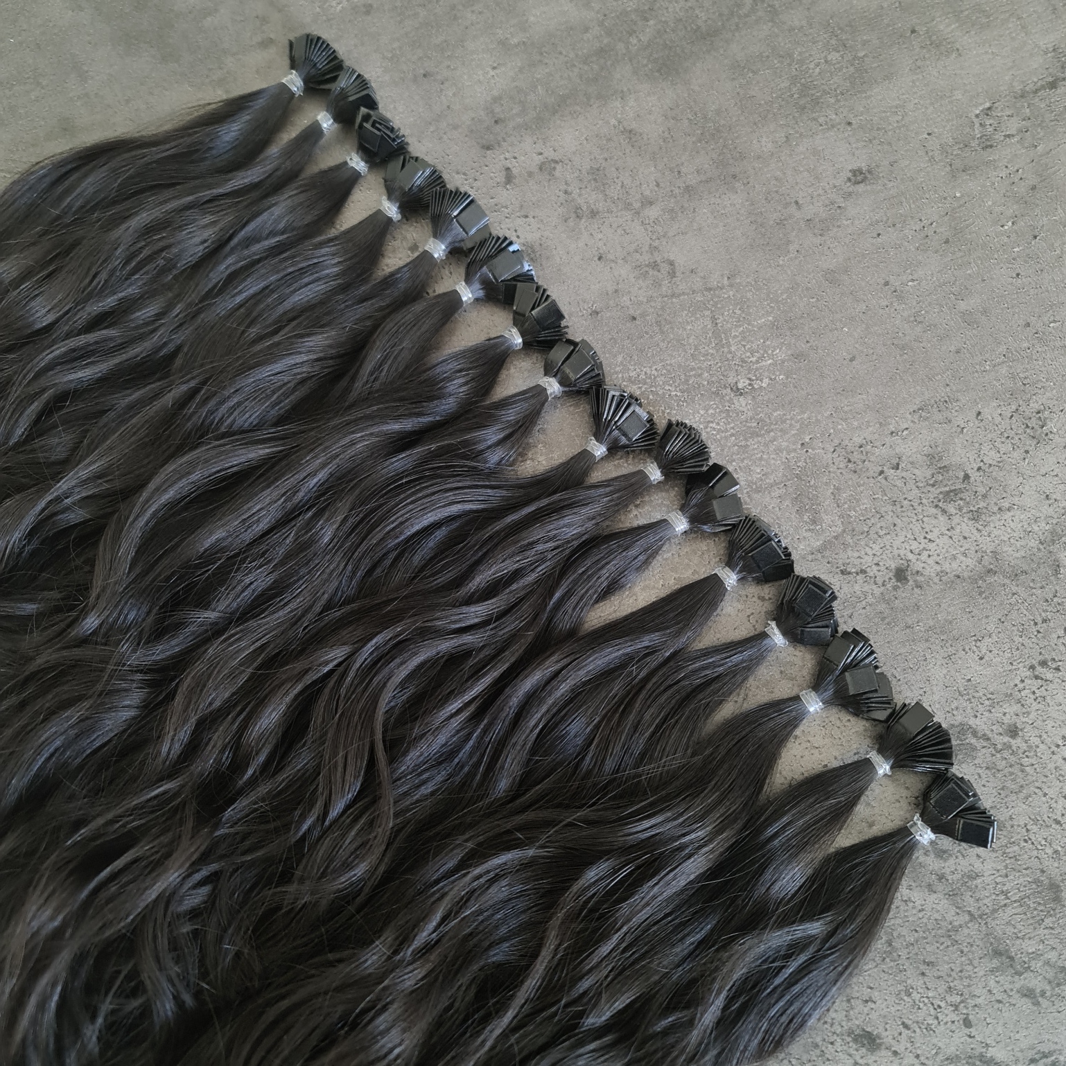 Diese Echthaar-Bondings sind 35–40 cm lang und besitzen eine natürlich gewellte Struktur mit Natural Ends für einen sanften, harmonischen Abschluss. Der Farbton N1 – Naturschwarz ist ungefärbt und naturbelassen – ein tiefes, sattes Dunkelbraun mit elegantem, natürlichem Glanz.