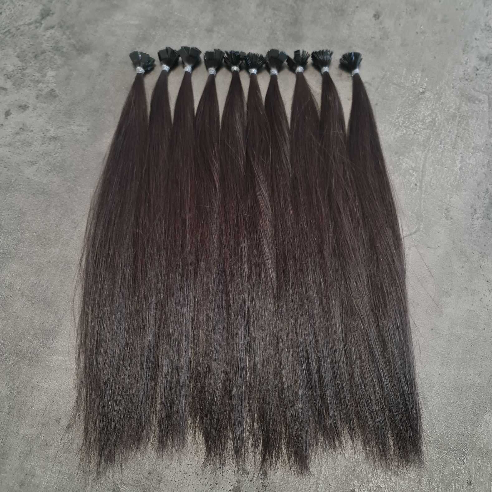 Diese Echthaar-Bondings sind 35–40 cm lang und besitzen eine glatte, besonders seidig fallende Struktur mit Natural Ends für einen sanften, natürlichen Abschluss. Der Farbton 02 – Schwarzbraun wirkt tief, elegant und natürlich mit feinem Glanz.
