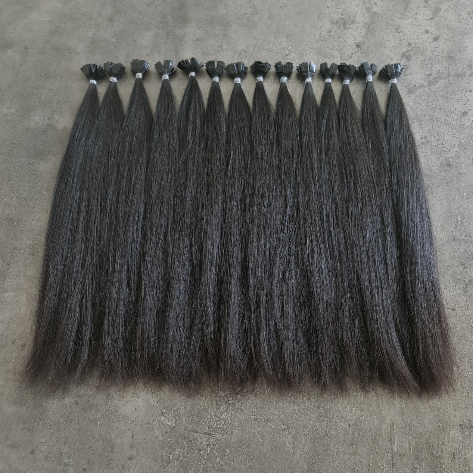 Diese Echthaar-Bondings sind 35–40 cm lang und besitzen eine glatte, seidig fallende Struktur mit Natural Ends für einen sanften, natürlichen Abschluss. Der Farbton N1 – Naturschwarz ist ungefärbt und naturbelassen, mit tiefem, sattem Glanz und elegantem Ausdruck.