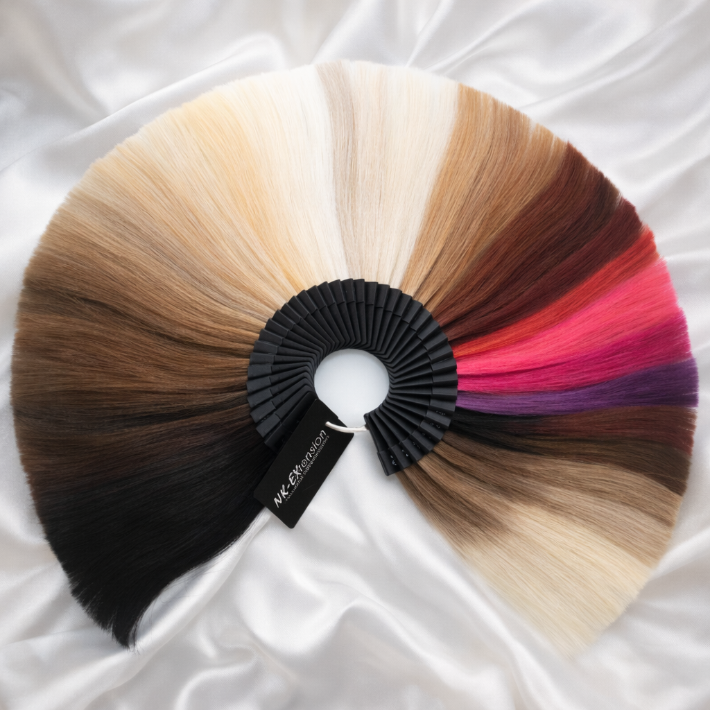 Unser Farbring wird aus originalem NK-Extension Schnitthaar gefertigt, sodass die faszinierende Brillanz und die feinen Nuancen unserer Extensionsprodukte noch besser zur Geltung kommen. Die Farbmuster können einfach vom Ring abgenommen werden, was die Auswahl am Eigenhaar deutlich erleichtert.