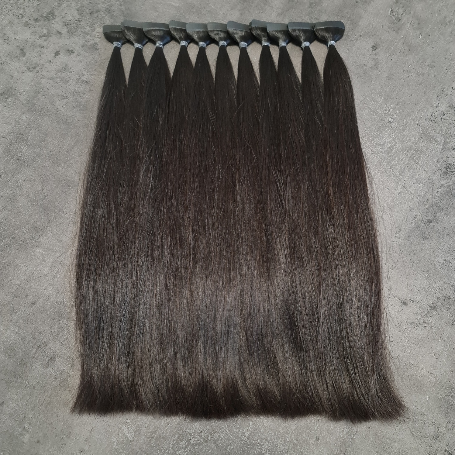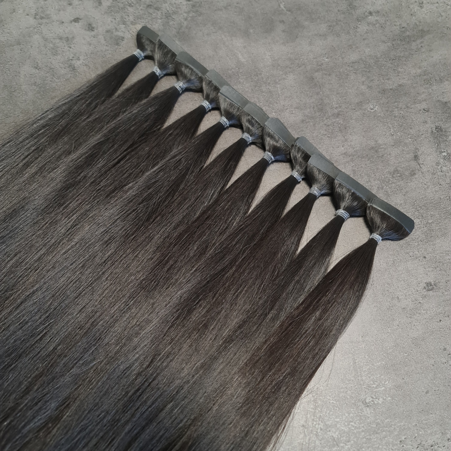 Diese Echthaar-Tape-Extensions sind 45 cm lang und besitzen eine glatte, seidig fallende Struktur mit Full Ends für eine gleichmäßig volle und gepflegte Optik. Der Farbton N2 – Dunkles Naturbraun ist ungefärbt und naturbelassen – ein satter, neutraler Braunton mit natürlichem Glanz und eleganter Tiefe.
